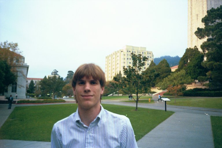 I am standing on the University of California, Berkeley campus. Evans Hall (location of the math department) is behind me, just to the right of my head. Taken 20 October 1997.