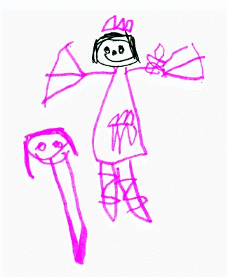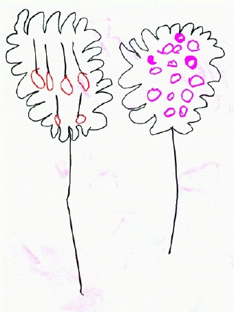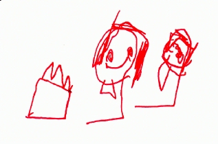 Heather and Caroline smelling some flowers. Heather tells me that they're also eating, but when I asked her what they were eating, she said "I don't know; I didn't draw that part." (February 1998)