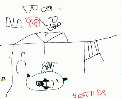 Madeleine riding a beluga whale. Also an umbrella, a house, and Madeleine's ballet accoutrements. Does this child have a vivid imagination or what? (February 1998)